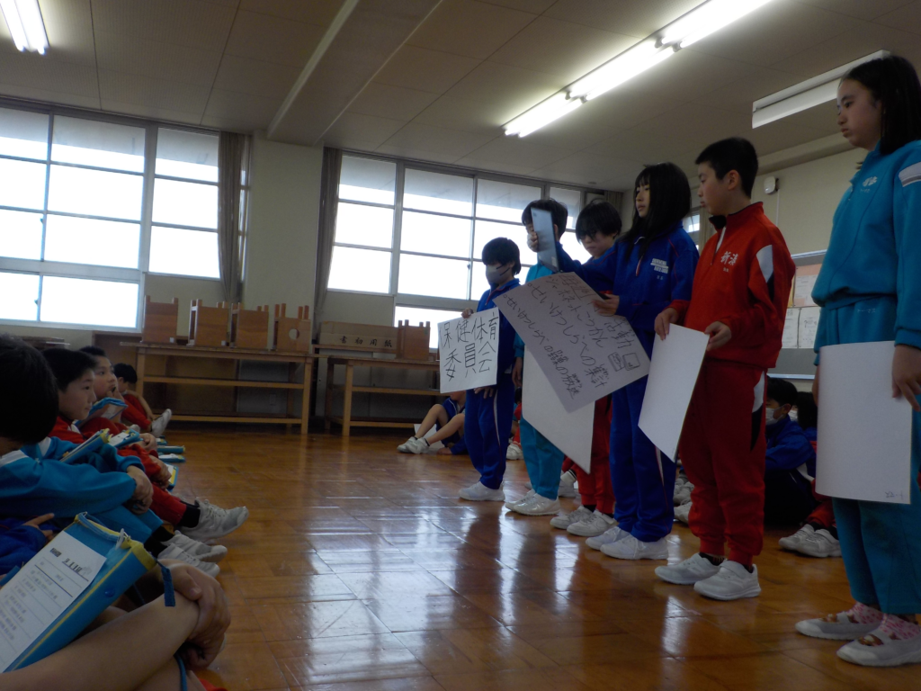 5年生から始まる委員会活動に向けて、6年生が5年生の初めての委員会選びの参考となるように各委員会の紹介を行いました。発表では、前年度の経験をもとに、常時活動や特別な活動について具体的に説明し、それぞれの委員会に求められる姿についても伝えました。
