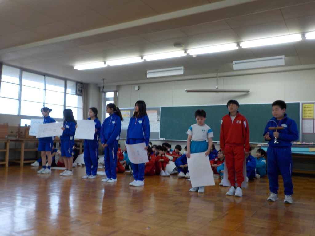 はじめに、がんばり発表がありました。代表の児童は、3学期で身に付いた力やがんばったことについて振り返ったことを、全校に向けて堂々と話していました。
